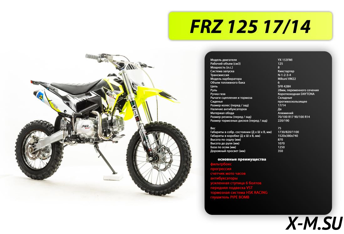 Дополнительная информацияЦена на товар Питбайк PWR Racing FRZ 125 17/14 не является итоговой и может измениться в зависимости от валютных курсов, общей экономической ситуации или логистических и иных факторов.